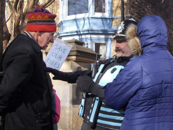 More campaigners than yesterday, 60 at the height of the action, peacefully and loudly protested both the fellings and the arrests.