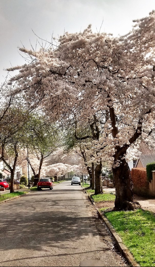 A few days later, I went to visit some of the most famous cherry trees in my home city of Sheffield. It was damp and drizzly: fog on the hills and a raw, scouring edge to the air. But the trees on Abbeydale Park Rise were blooming as if in defiance of the weather: deep crimson shading to pale pink against the blank sky.